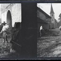 - Hommes et machine agricole dans une rue de village